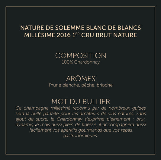 Nature de Solemme Blanc de Blancs 1er Cru - Millesime 2016 - Brut NaturePrix habituel À partir de €55,00Prix habituelPrix unitaire / par-