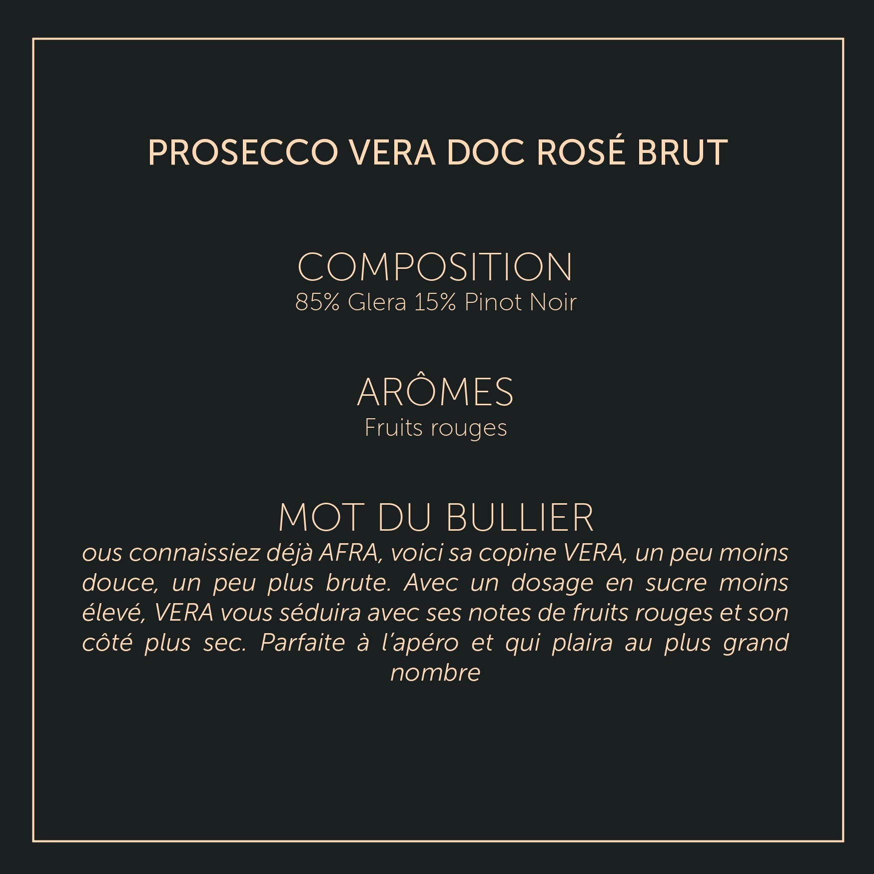 Le mot du Maître Bullier : Vous connaissiez déjà AFRA, voici sa copine VERA, un peu moins douce, un peu plus brute. Avec un dosage en sucre moins élevé, VERA vous séduira avec ses notes de fruits rouges et son côté plus sec. Parfaite à l’apéro et qui plaira au plus grand nombre.